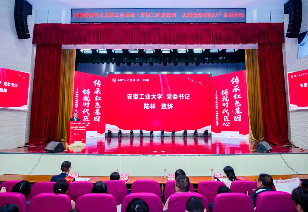 陆林代表学校致欢迎辞,对省总工会、省教科文卫体工会长期以来关心支持学校人才培养工作、助力青年成长成才表示感谢。他指出,伟大抗战精神是中国人民弥足珍贵的精神财富,劳模工匠是新时代传承和践行伟大抗战精神的优秀典范,他们身上体现的劳模精神和工匠精神是当代青年学子成长成才路上最生动的“教科书”。广大师生要深入学习领会党的二十届四中全会精神,在聆听历史回响中感悟伟大抗战精神的核心要义,从劳模工匠身上学习爱党报国、实干奋进的意志品格,将个人的理想追求和成长进步与国家的命运紧密相连,与民族的复兴同频共振,刻苦学习、锤炼本领、追求卓越,努力成为值得信任、可堪大任的时代新人,为实现第二个百年奋斗目标,以中国式现代化全面推进强国建设、民族复兴伟业贡献磅礴青春力量。