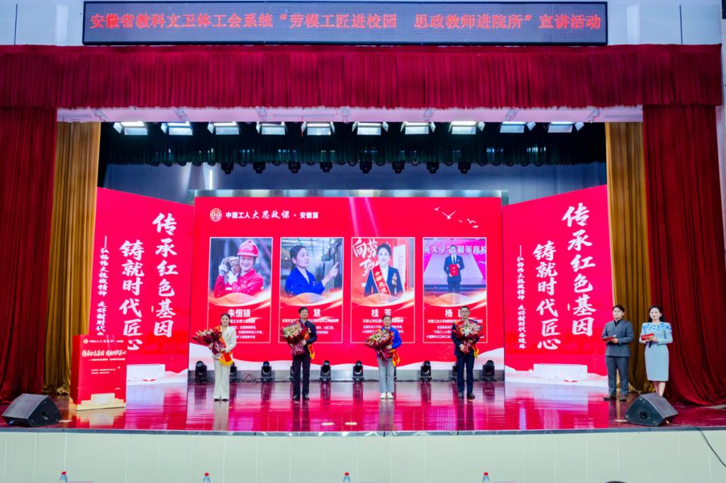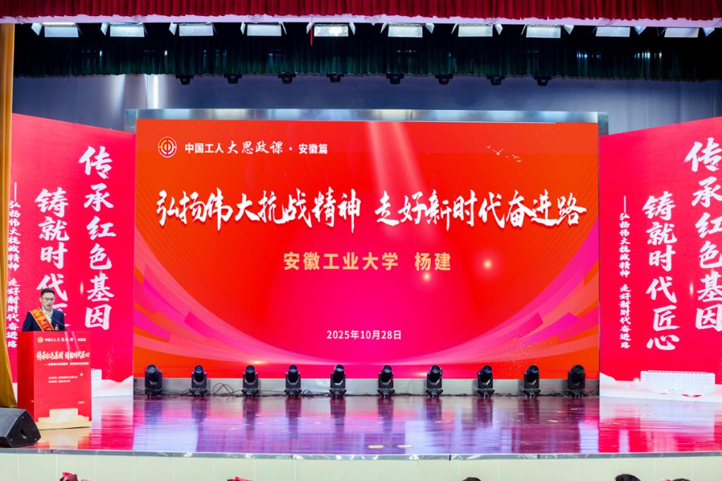活动现场,全国最美高校辅导员、安徽省“五一劳动奖章”获得者、全国首批“中国工人大思政课”专家名师库成员、中国教科文卫体工会系统“双进”活动宣讲团成员、我校材料科学与工程学院党委书记杨建作《弘扬伟大抗战精神,走好新时代奋进路》主题宣讲。