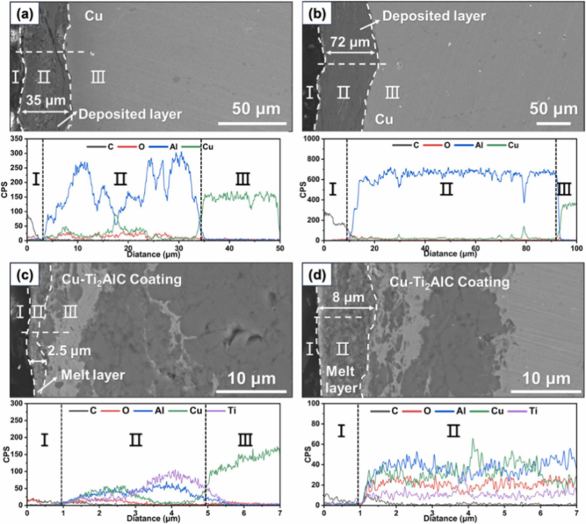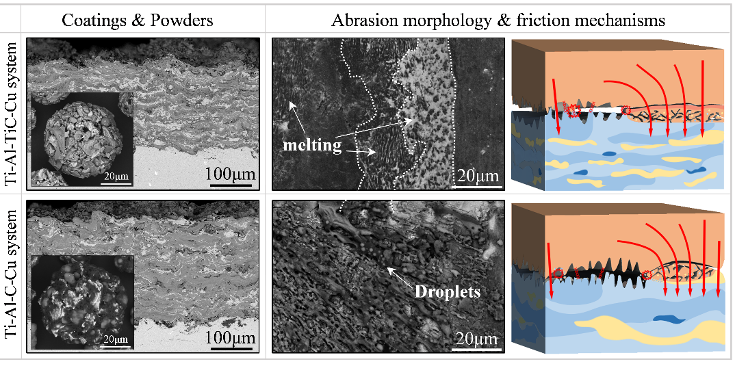 钛合金与铜合金作为现代工业中备受瞩目的高性能金属材料,因其各自优异的强度、耐腐蚀性及导电导热性,在航空航天、海洋工程及电子通讯等领域发挥着关键作用。然而,在严苛服役环境下耐磨性不足限制了其进一步推广应用。团队采用热喷涂技术分别在钛合金和铜合金表面成功制备出高性能耐磨防护涂层,为解决上述材料在极端环境中的磨损难题提供了创新思路与技术支撑。