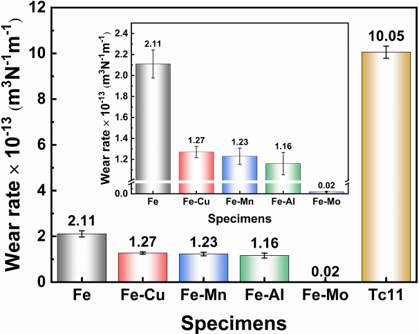 团队针对FeCoCrNi高熵合金涂层的高温磨损问题,采用Cu、Mn、Al、Mo元素掺杂策略,结合实验与第一性原理计算揭示了元素掺杂诱导润滑机制。其中Mo掺杂涂层性能最优,在700℃高温条件下的磨损率低至2×10-15 m3 N-1 m-1。高温下该涂层表面形成的NiMoO₄氧化膜具备低键能特性,在磨损过程中发挥良好润滑作用,同时涂层在高温下仍保持较高硬度,二者协同作用显著提升了涂层的耐磨性能,较钛合金基体提升了两个数量级。材料科学与工程学院博士生吴旺朋为论文第一作者。