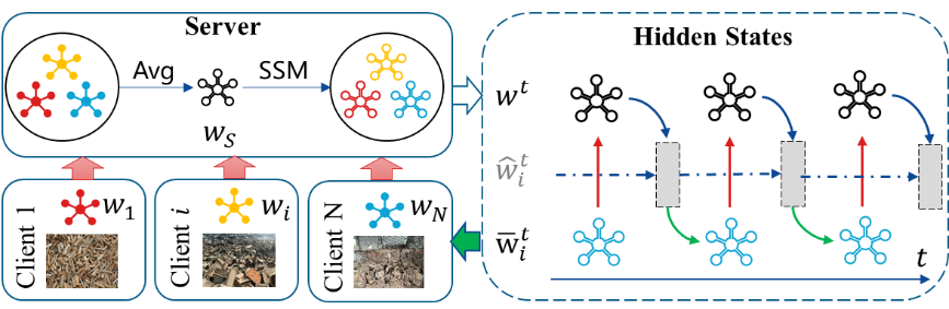 针对边缘设备个性化联邦学习中的双向灾难性遗忘问题,团队在《IEEE Transactions on Mobile Computing》上提出了一种面向复杂时序建模的联邦学习新方法(FedSSM)。该方法从状态空间建模的角度出发,有效提升了联邦环境下对长时序依赖关系的刻画能力,在保证数据隐私的同时显著增强了模型在非独立同分布(Non-IID)场景下的稳定性与泛化性能。在多个公开数据集上的实验结果表明,该方法在多种时序预测与移动计算任务中均优于现有主流联邦学习算法,展现出良好的鲁棒性与实用价值。