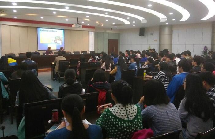 Patricia和Emma为商学院国际合作班同学做了赴美国留学的专题宣讲。10日下午,Longwood大学代表还对即将赴该校留学的我校学生进行了语言测试。(撰稿:樊永刚 审核:戴俊霞 邹珏)