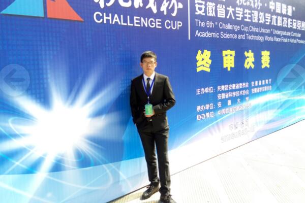 在校期间,他积极进取,努力学习专业课程知识,积极参与各项科技创新创业活动,先后获得2014年IGEM国际遗传工程机器设计大赛国际总决赛银奖,第六届“挑战杯”安徽省大学生课外学术科技作品竞赛一等奖,第十四届“挑战杯”全国大学生课外学术科技作品竞赛二等奖。在校院级各类创新创业竞赛中获奖近10项;主持国家级创新训练项目两项,参与国家级大学生创新训练项目一项;以第一作者发表中文核心期刊学术论文一篇,参与发表EI收录国际会议论文一篇。先后获得校一等奖学金、二等奖学金、Umatel奖学金和力生奖学金等,荣获“校三好学生”、“校社会工作优秀学生” 、“社团年度人物”、“科技创新之星”等荣誉称号。
