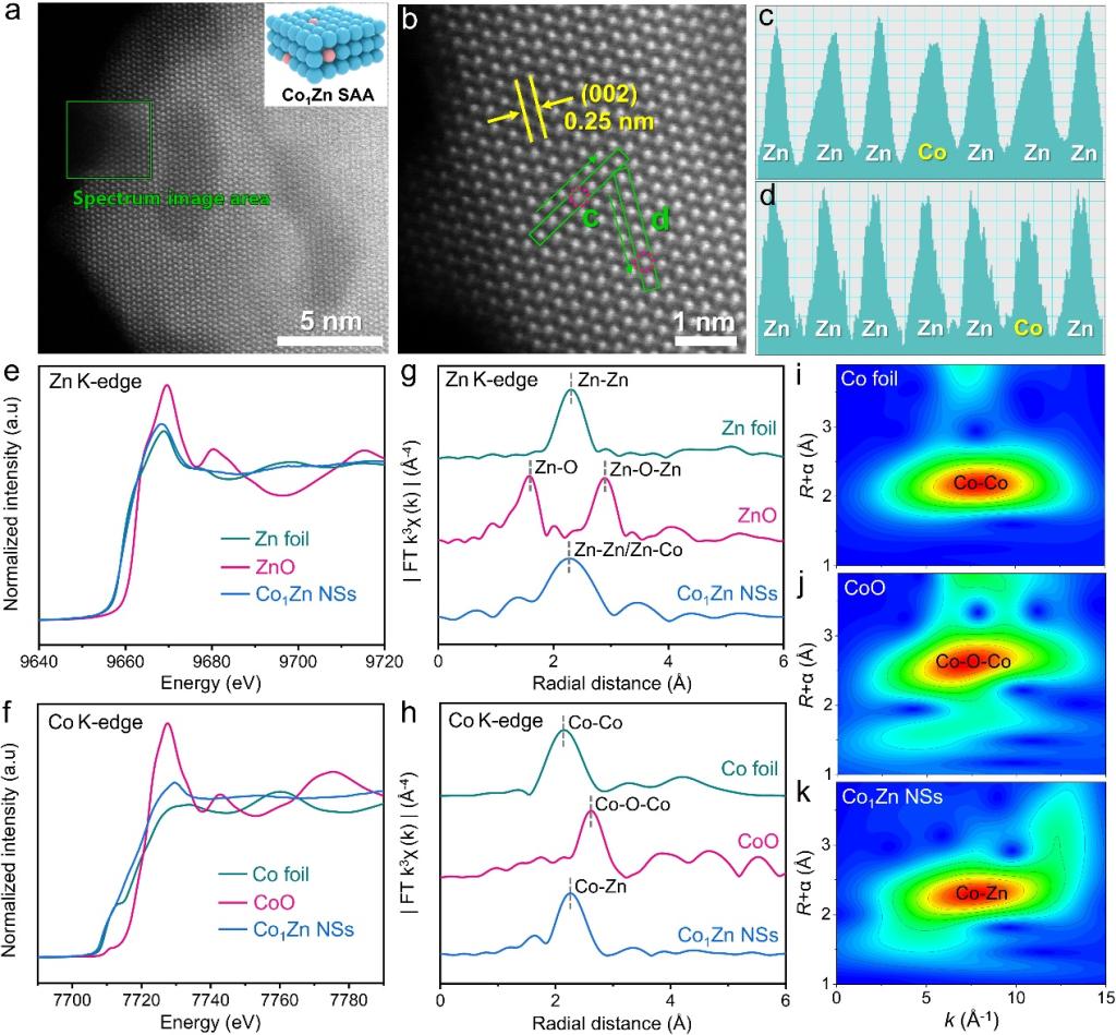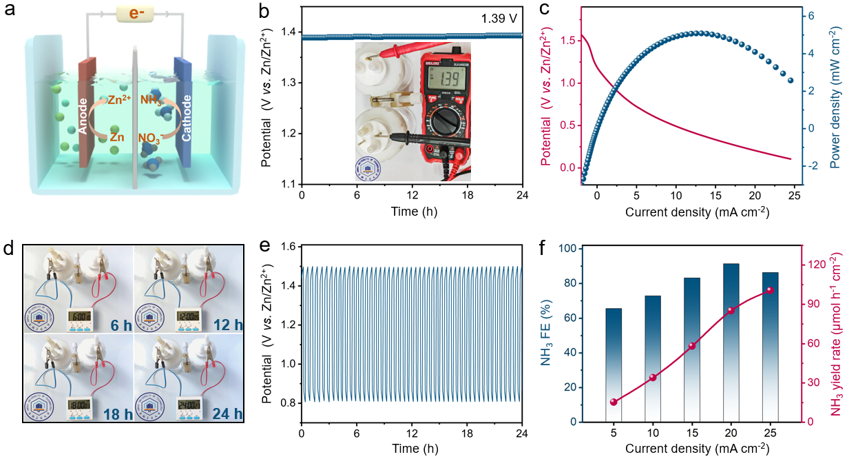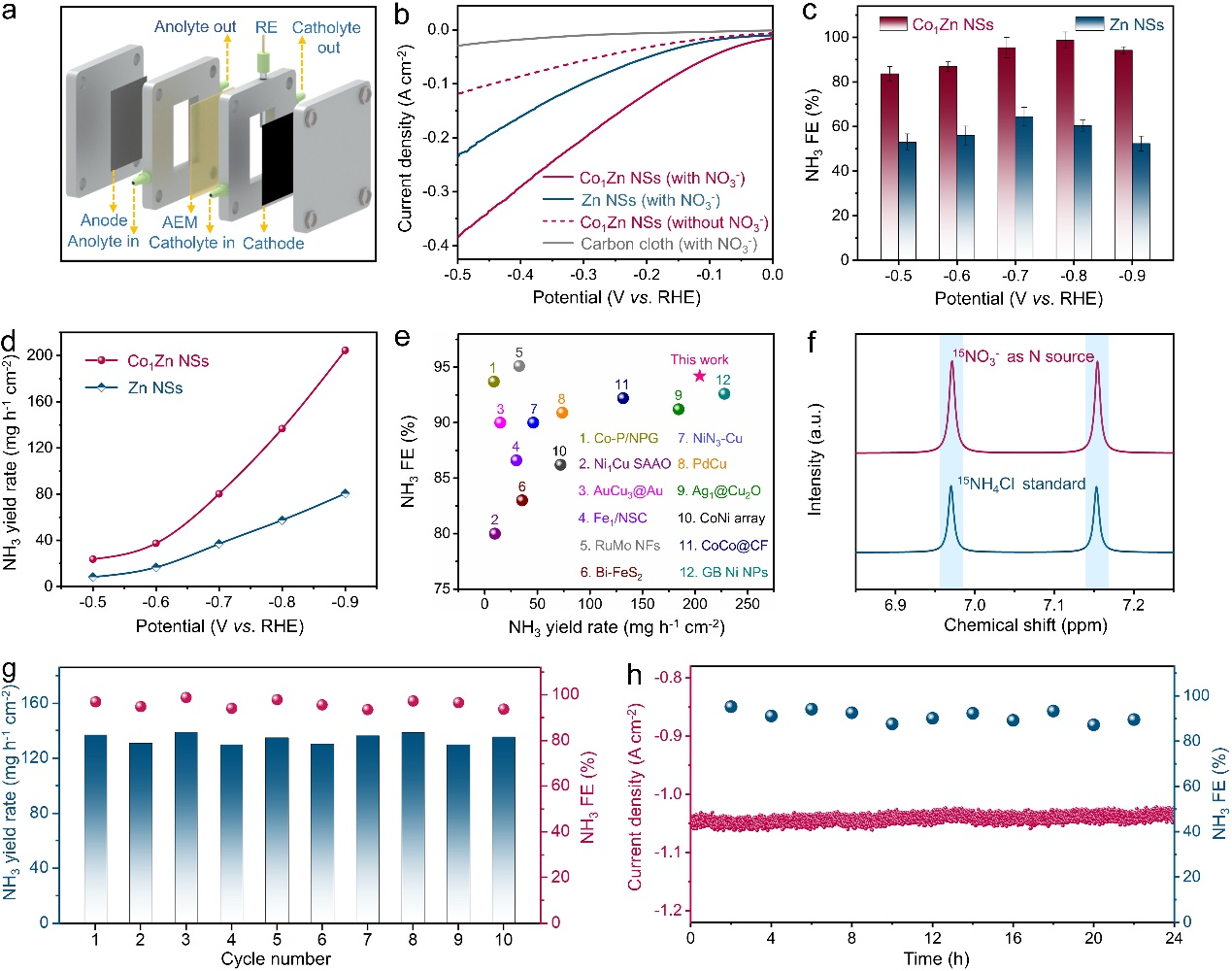 为了解决这一难题,团队通过精巧的单原子合金设计,开发了一种Co1Zn非贵金属氢溢流体系,成功解决了电催化硝酸盐还原合成氨反应中活性氢的供应难题。凭借该催化体系中显著的氢溢流效应,在安培级电流密度下实现了硝酸盐到氨的高效催化转化。在流动电解池中,实现了高达2.4 A cm⁻2的合成氨反应电流密度和204.5 mg h⁻1 cm⁻2的产氨速率,性能远超未形成氢溢流效应的Zn纳米片催化剂。此外,基于该催化剂组装的Zn-NO3⁻可充电电池展现出优异性能,可以稳定的输出1.39 V的电压和5.51 mW cm-2的峰值功率密度。本研究揭示了非金属合金体系中氢溢流机制的可行性,为电催化氢化反应的催化剂设计提供了新思路。(撰稿:刘明凯 审核:韩新亚 张苒 黄敏)