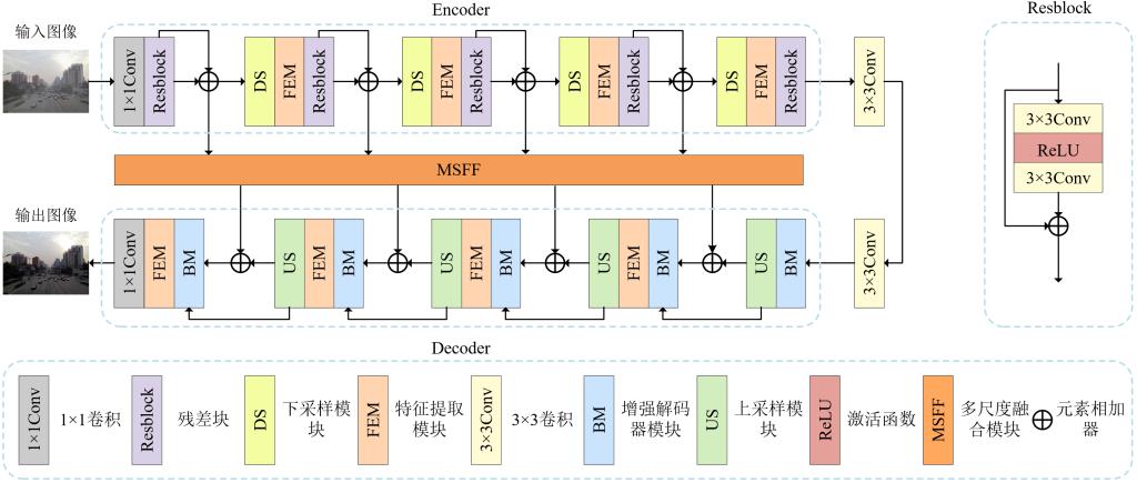 聚焦落地应用,研发轻量化实时图像去雾算法。针对自动驾驶、视频监控等实际应用场景对图像处理实时性的迫切需求,研究设计了一种全新的轻量级特征提取模块,通过采用通道切分策略,在减少模型计算量的同时有效提取到图像的局部特征。此外,通过所构建的多尺度特征融合模块与增强解码模块,实现了多尺度上下文信息互补与雾区自适应增强,在保证复原精度的同时大幅提升模型推理速度。实验结果表明,该算法在合成数据集SOTS上取得PSNR/SSIM 32.32 dB/0.979(室内)与33.39 dB/0.982(室外)的优异表现,在真实场景数据集RTTS上亦表现鲁棒。更为重要的是,其单幅图像的平均处理时间仅需0.0261秒,在参数量与计算复杂度显著低于主流方法的同时,实现了实时去雾处理,为高动态视觉系统中的实时图像增强提供了高效可行的轻量化解决方案。相关成果发表在中国计算机学会(CCF)推荐的A类中文期刊《计算机辅助设计与图形学学报》,王永振博士为论文第一作者,刘恒教授为通讯作者。