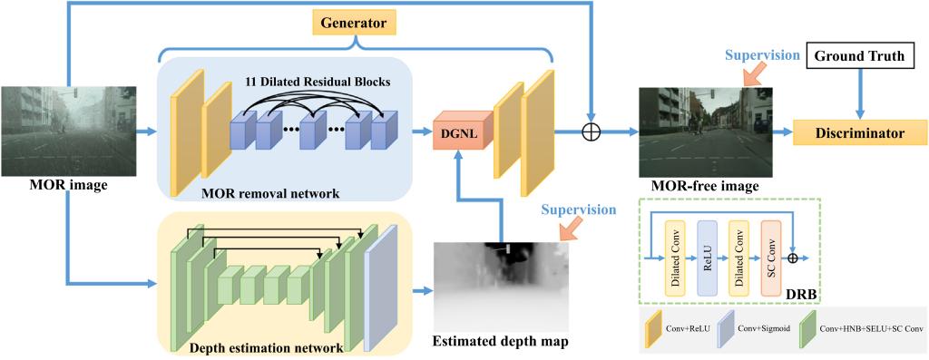 攻坚特定难题,深度引导混合雨雾去除新方法。针对真实场景中多种雨水(雨滴、雨线、雨雾)混合叠加这一特定难题,研究通过引入场景的深度信息作为一种额外的先验知识,将深度估计任务与混合雨雾去除任务相结合,构建了一种名为DEMore-Net的联合学习网络。该网络充分利用了雨水分布与场景深度的联系,通过深度信息指导网络在根部不同距离对不同类型的雨水进行精准去除,有效提升了模型在复杂雨雾场景下的泛化能力与复原精度。在方法设计上,DEMore-Net构建了基于编码器—解码器的深度估计子网络和基于生成对抗网络的雨雾去除子网络,引入深度引导的非局部模块实现特征融合,使复原过程更符合真实物理退化过程。此外,研究创新性地提出一种混合归一化模块,该模块结合了批归一化与实例归一化各自的优势,显著增强了网络训练的稳定性与学习能力。实验结果表明,该方法在合成数据集RainCityscapes++和真实雨天场景下均显著优于现有最先进的图像去雨算法,在PSNR、SSIM等客观指标及视觉质量上均达到最优,为复杂天气下的图像复原提供了有效的深度引导新范式。相关成果发表在神经网络领域权威期刊《Neural Networks》,王永振博士为论文第一作者。